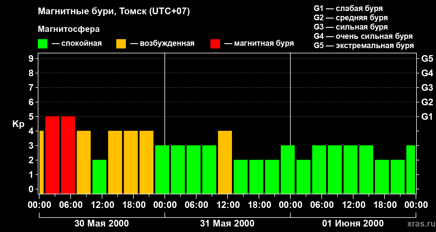 Изменения геомагнитного индекса Kp с 30 мая по 1 июня 2000 года для средних широт