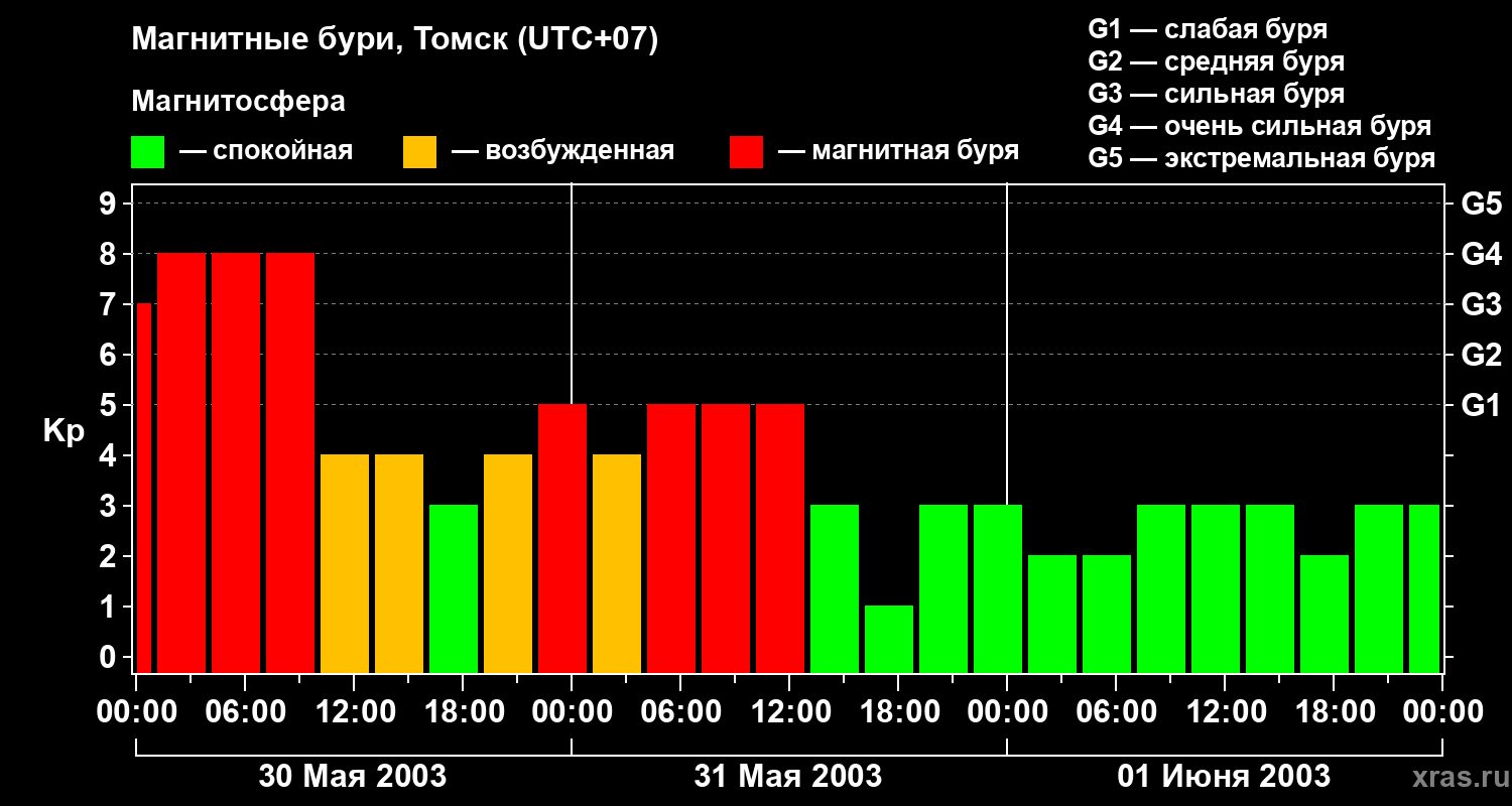 Изменения геомагнитного индекса Kp с 30 мая по 1 июня 2003 года для средних широт