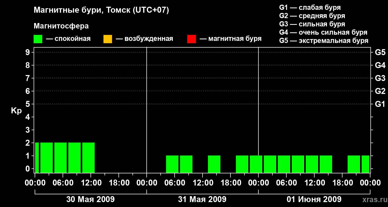 Изменения геомагнитного индекса Kp с 30 мая по 1 июня 2009 года для средних широт
