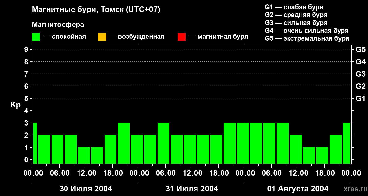 Изменения геомагнитного индекса Kp с 30 июля по 1 августа 2004 года для средних широт