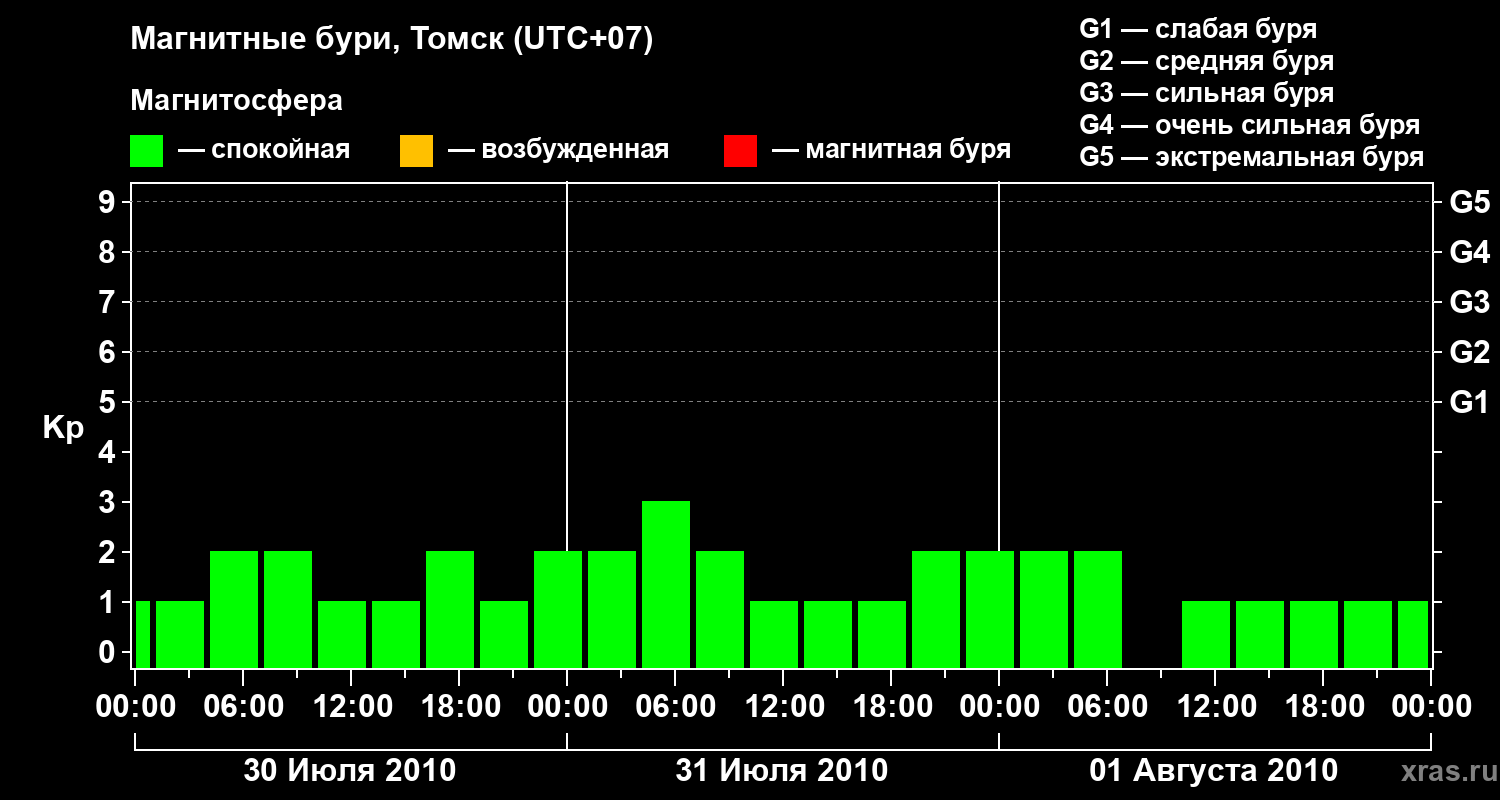 Изменения геомагнитного индекса Kp с 30 июля по 1 августа 2010 года для средних широт