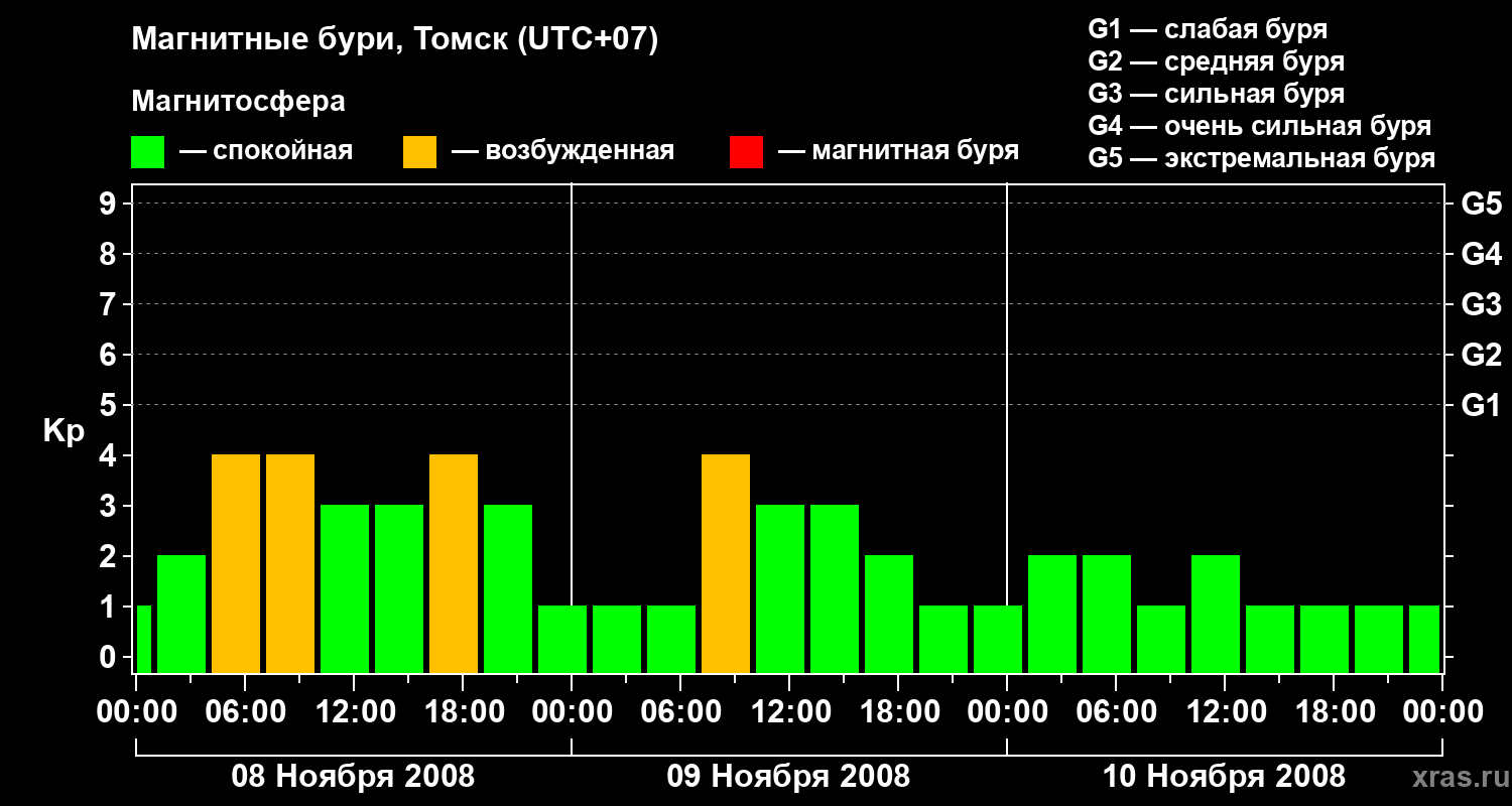 Изменения геомагнитного индекса Kp с 8 по 10 ноября 2008 года для средних широт