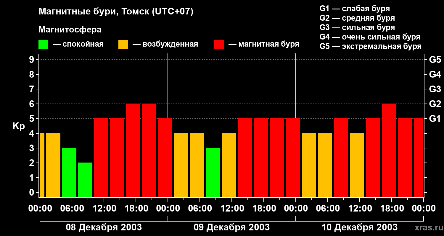 Изменения геомагнитного индекса Kp с 8 по 10 декабря 2003 года для средних широт