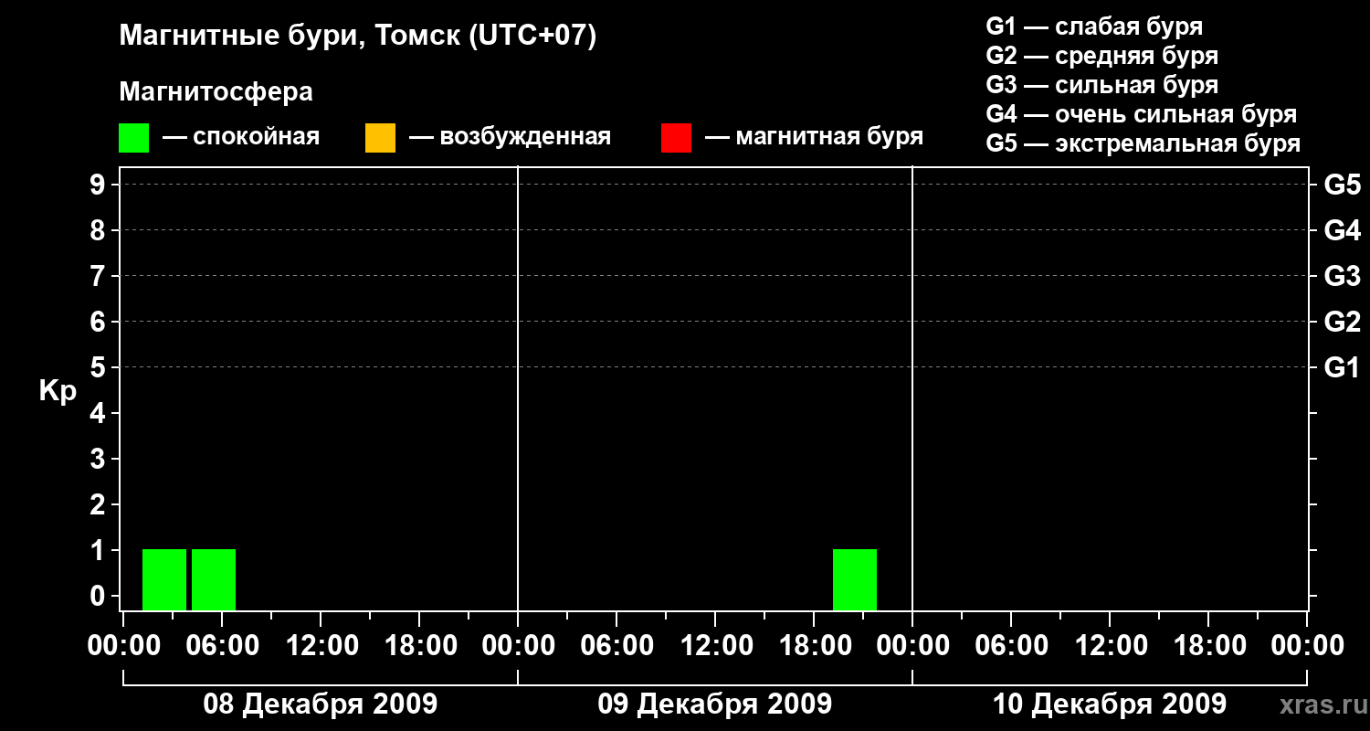 Изменения геомагнитного индекса Kp с 8 по 10 декабря 2009 года для средних широт