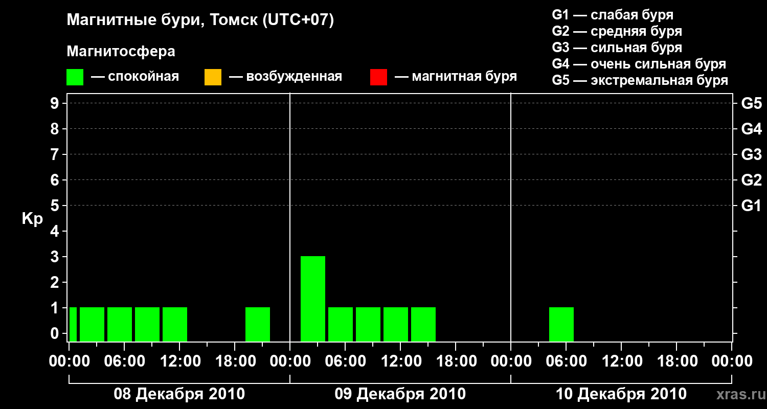 Изменения геомагнитного индекса Kp с 8 по 10 декабря 2010 года для средних широт