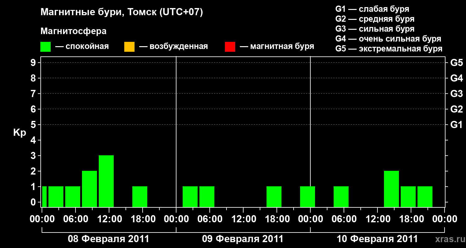 Изменения геомагнитного индекса Kp с 8 по 10 февраля 2011 года для средних широт