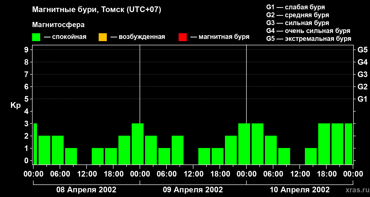 Изменения геомагнитного индекса Kp с 8 по 10 апреля 2002 года для средних широт