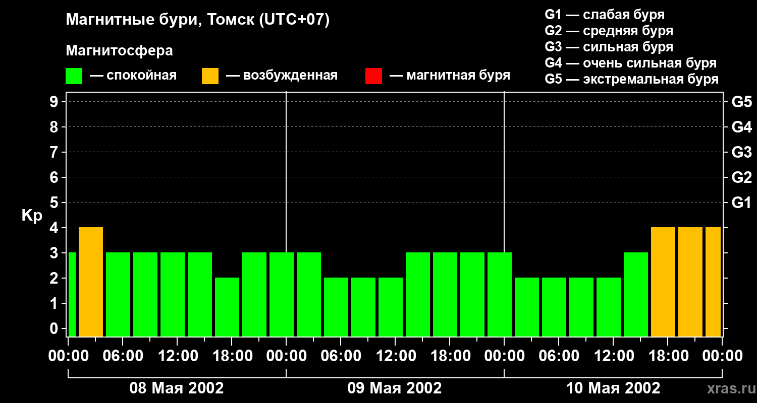 Изменения геомагнитного индекса Kp с 8 по 10 мая 2002 года для средних широт