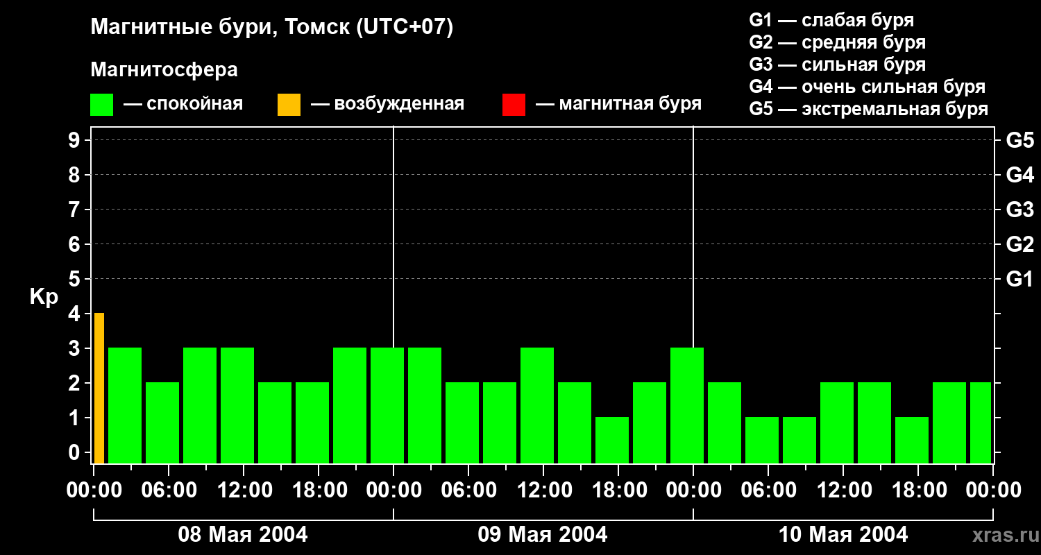 Изменения геомагнитного индекса Kp с 8 по 10 мая 2004 года для средних широт