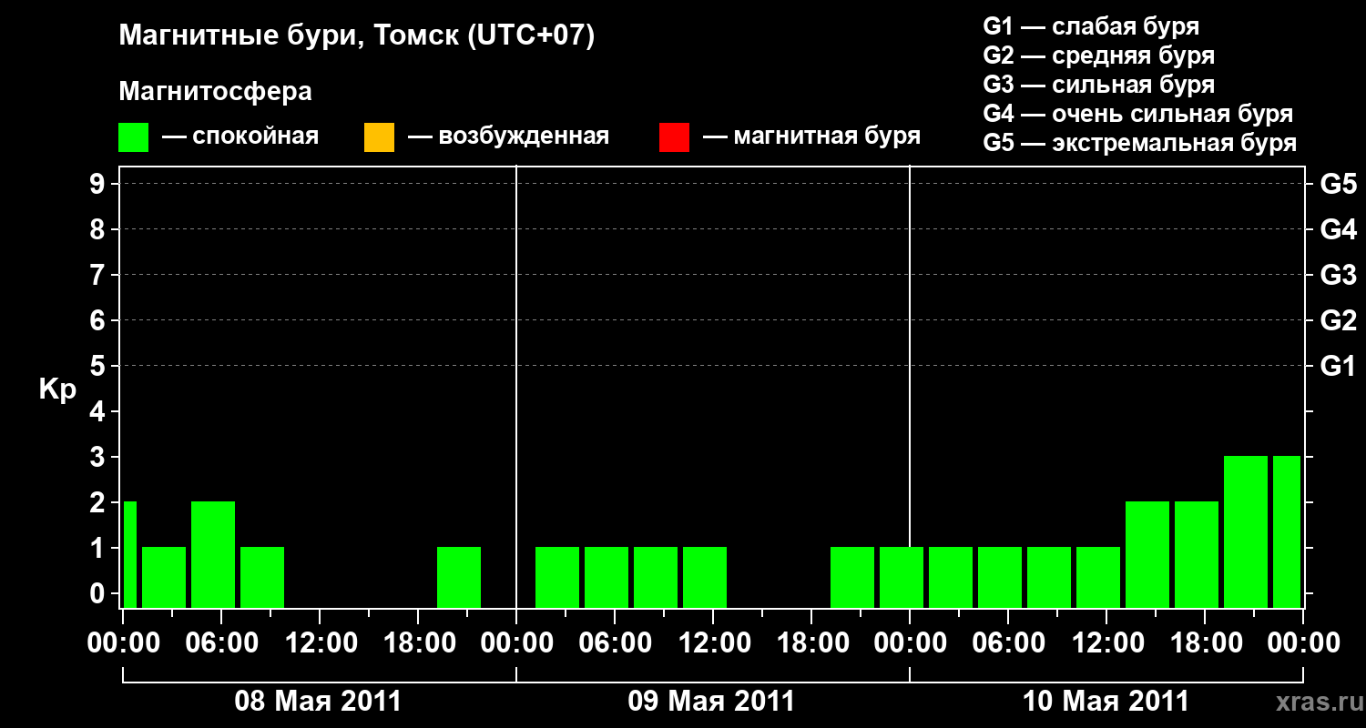 Изменения геомагнитного индекса Kp с 8 по 10 мая 2011 года для средних широт