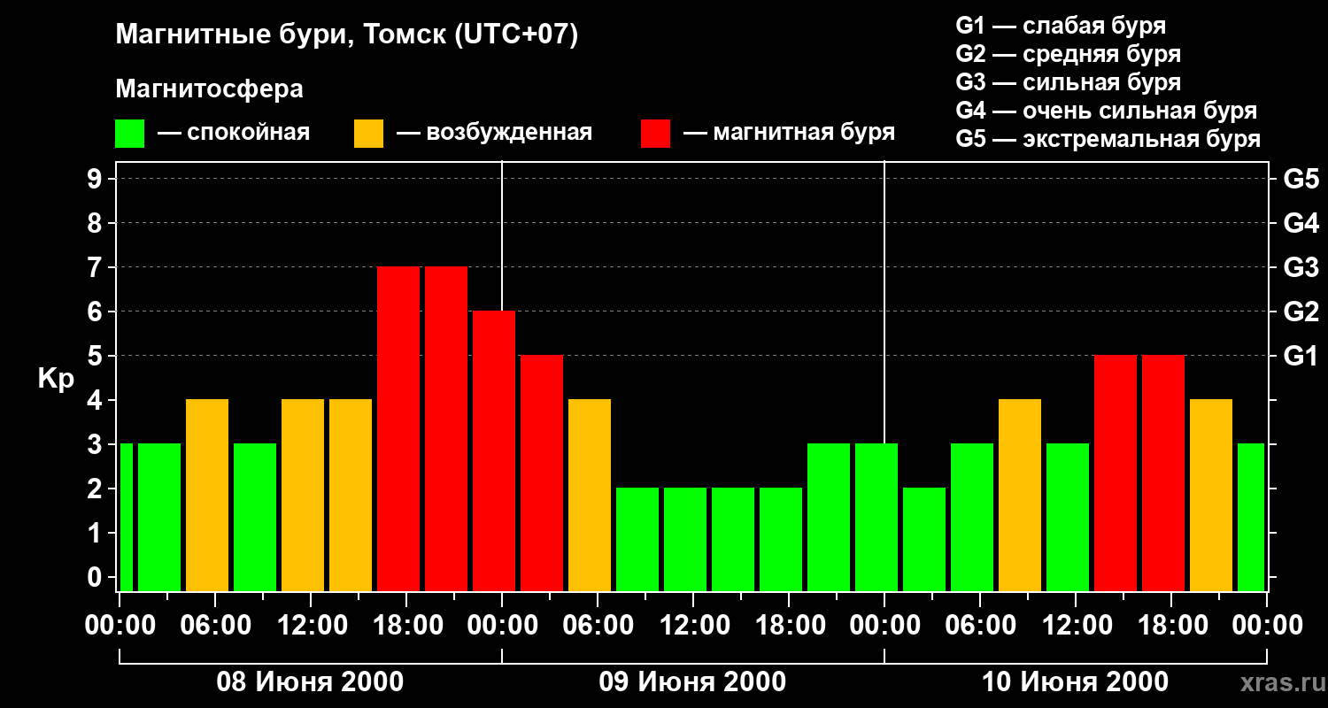 Изменения геомагнитного индекса Kp с 8 по 10 июня 2000 года для средних широт