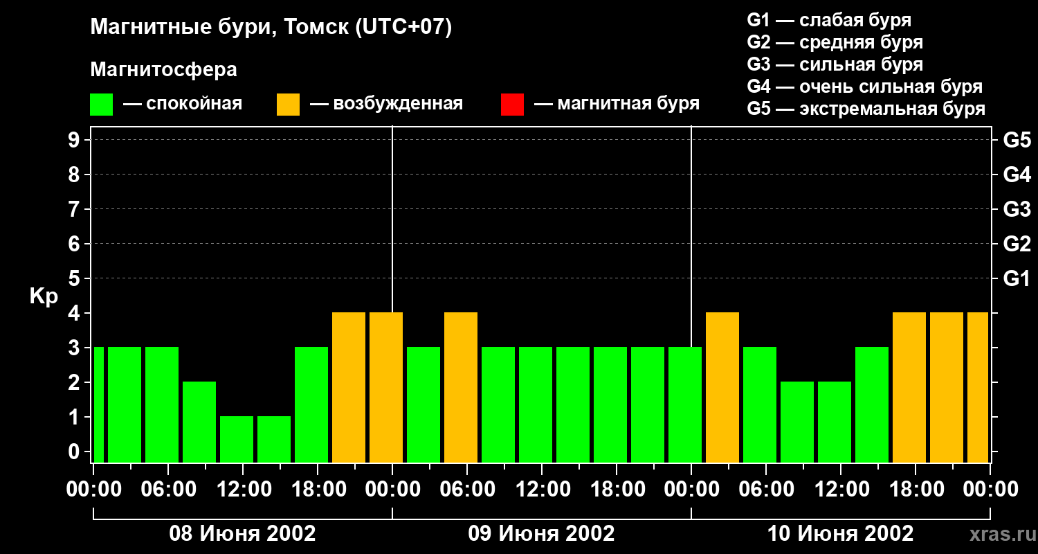 Изменения геомагнитного индекса Kp с 8 по 10 июня 2002 года для средних широт