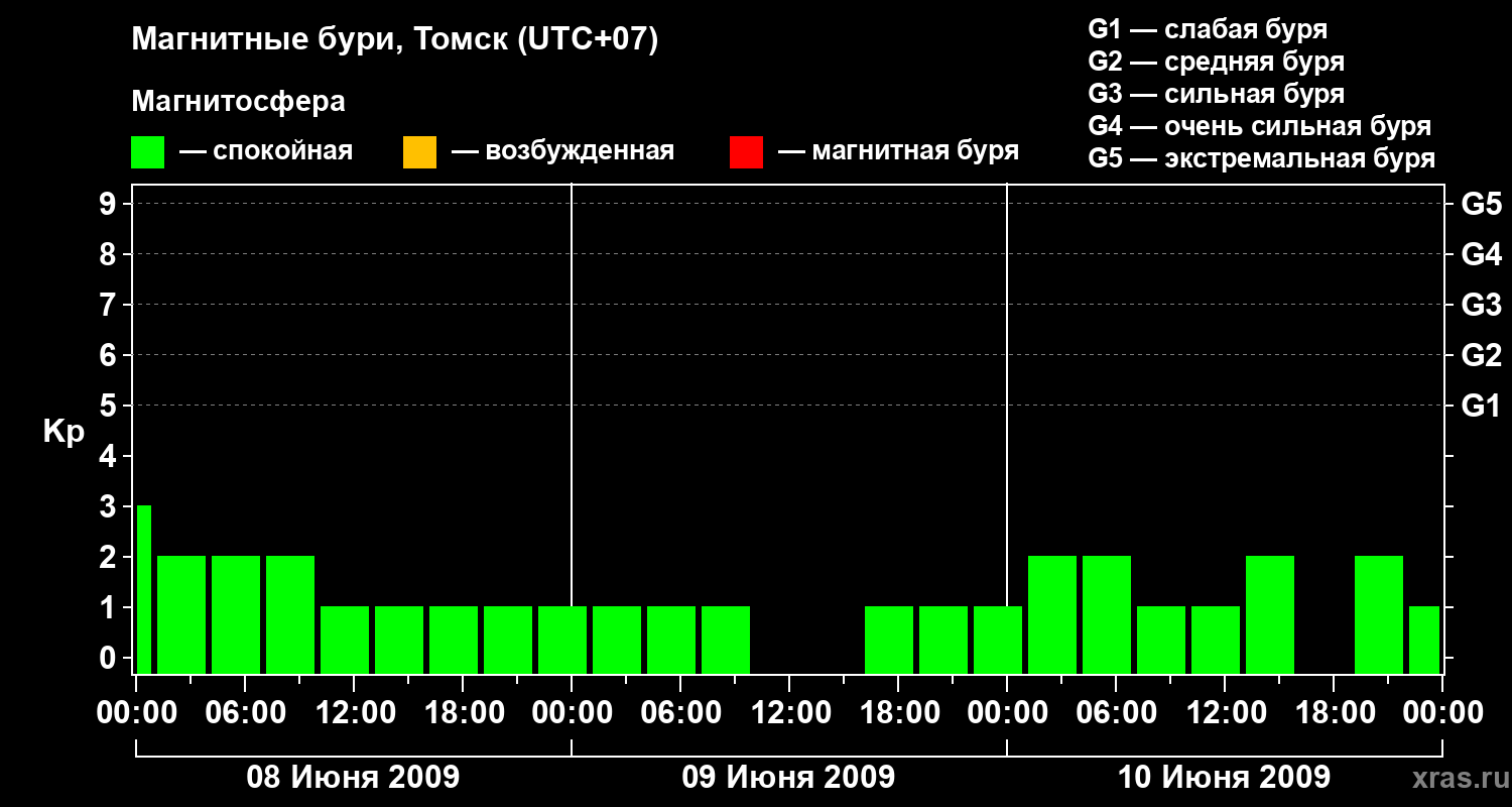 Изменения геомагнитного индекса Kp с 8 по 10 июня 2009 года для средних широт