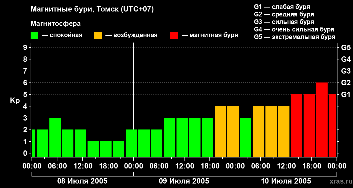 Изменения геомагнитного индекса Kp с 8 по 10 июля 2005 года для средних широт