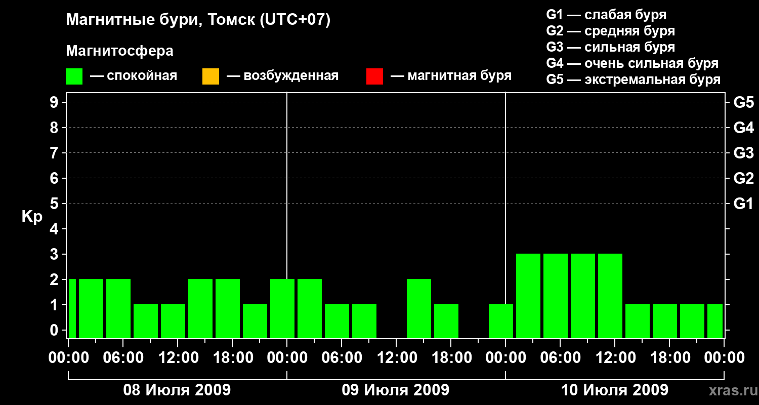 Изменения геомагнитного индекса Kp с 8 по 10 июля 2009 года для средних широт