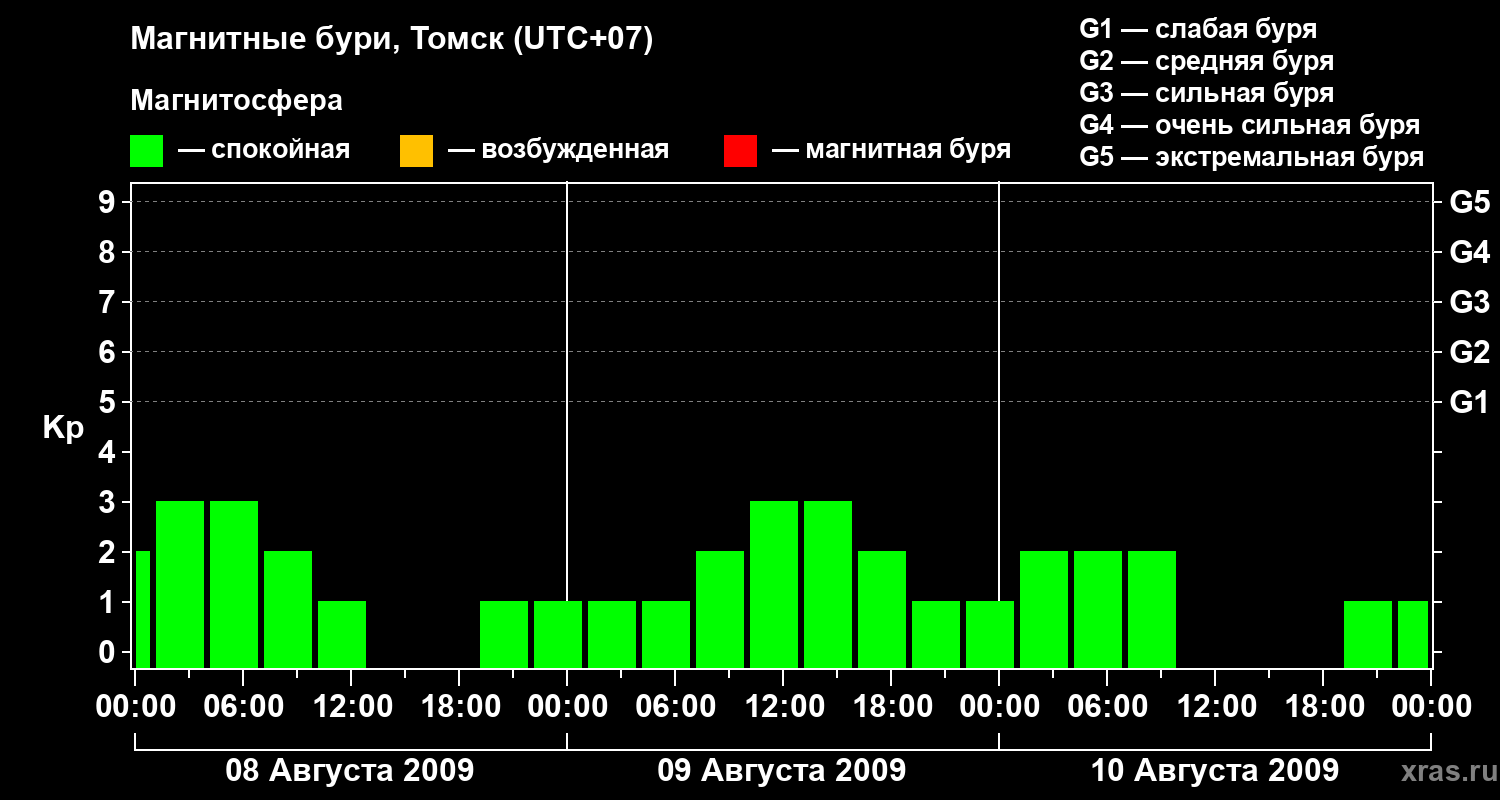 Изменения геомагнитного индекса Kp с 8 по 10 августа 2009 года для средних широт