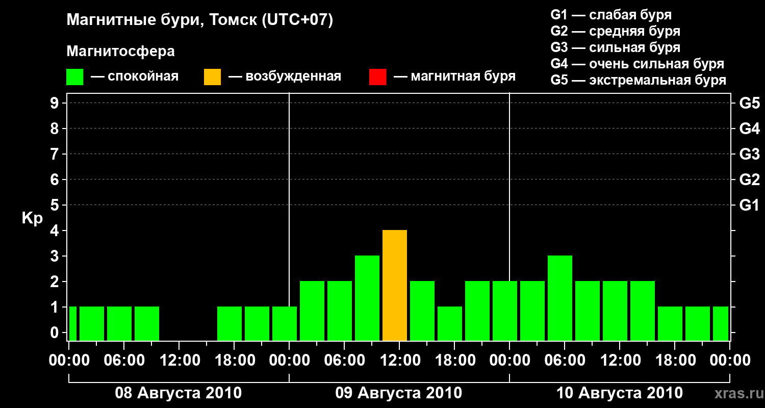 Изменения геомагнитного индекса Kp с 8 по 10 августа 2010 года для средних широт