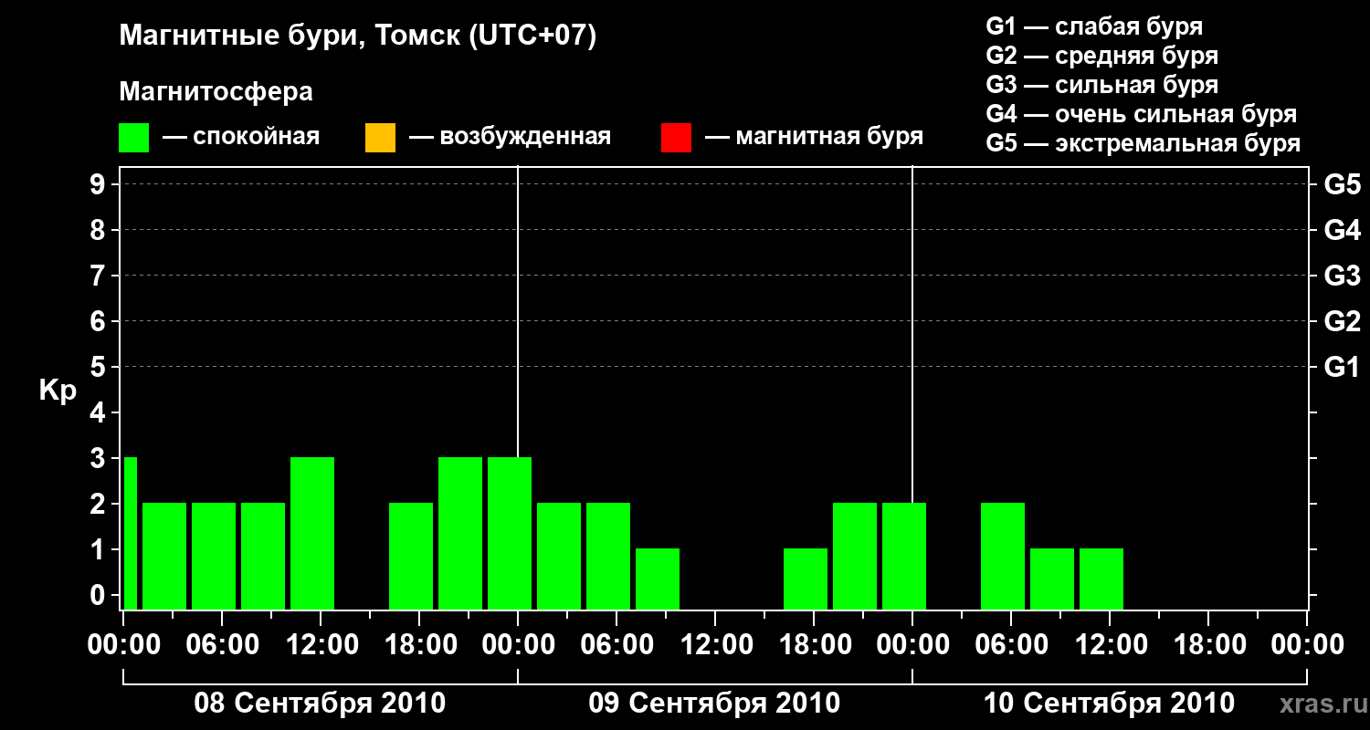 Изменения геомагнитного индекса Kp с 8 по 10 сентября 2010 года для средних широт