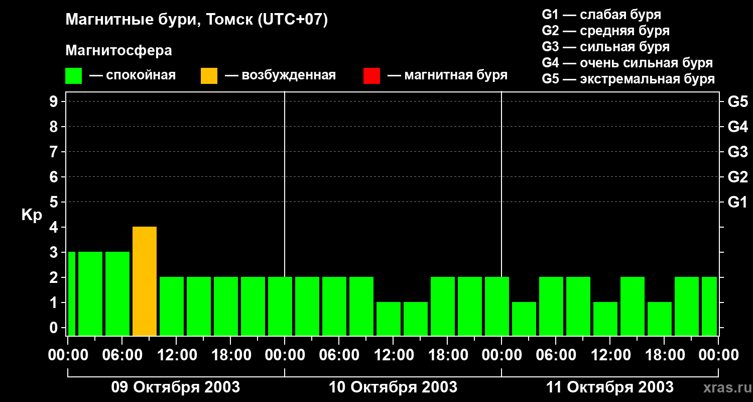 Изменения геомагнитного индекса Kp с 9 по 11 октября 2003 года для средних широт