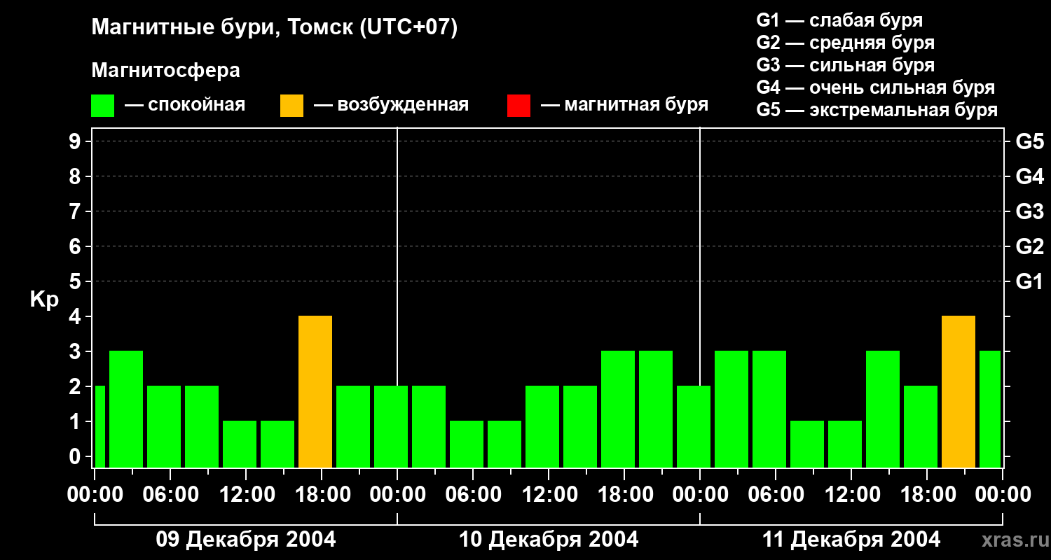 Изменения геомагнитного индекса Kp с 9 по 11 декабря 2004 года для средних широт