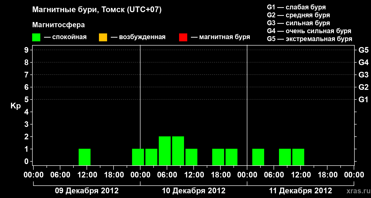 Изменения геомагнитного индекса Kp с 9 по 11 декабря 2012 года для средних широт