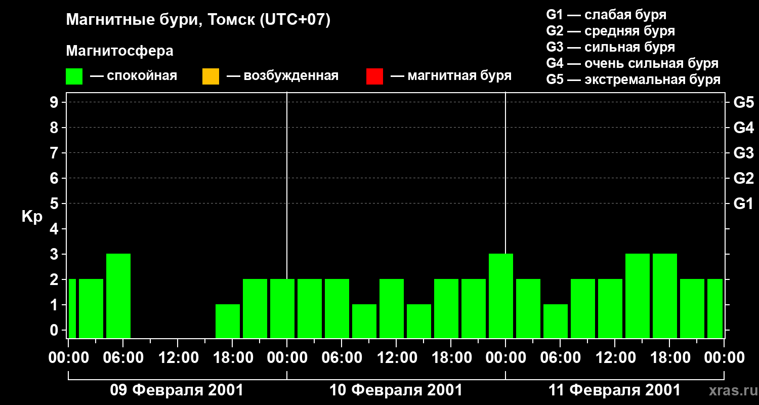Изменения геомагнитного индекса Kp с 9 по 11 февраля 2001 года для средних широт