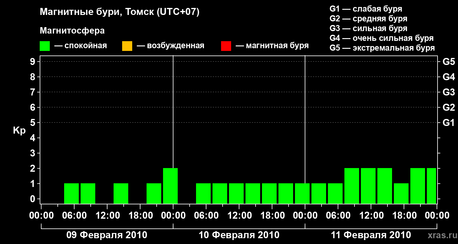 Изменения геомагнитного индекса Kp с 9 по 11 февраля 2010 года для средних широт