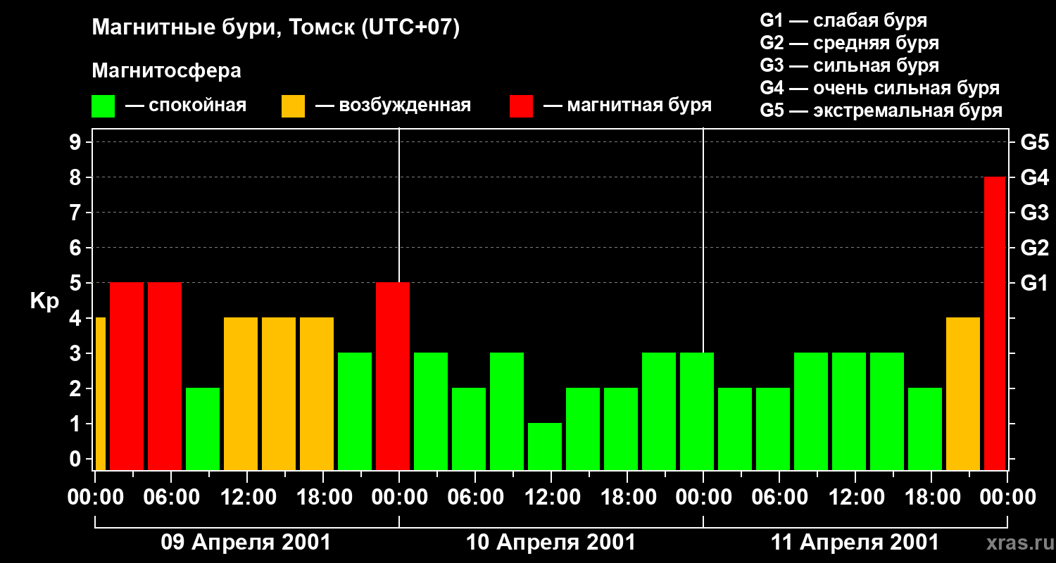 Изменения геомагнитного индекса Kp с 9 по 11 апреля 2001 года для средних широт