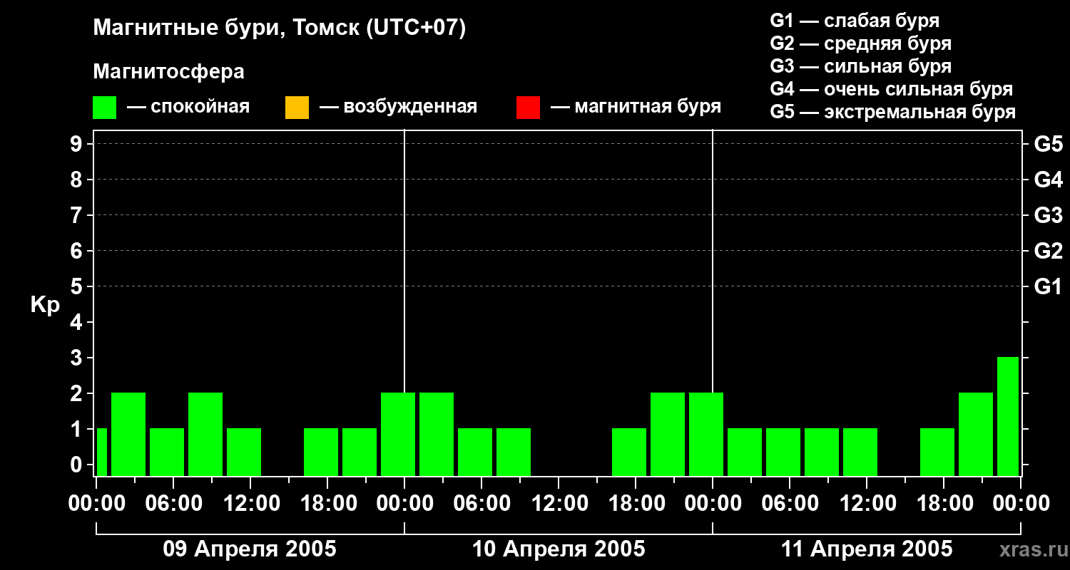 Изменения геомагнитного индекса Kp с 9 по 11 апреля 2005 года для средних широт