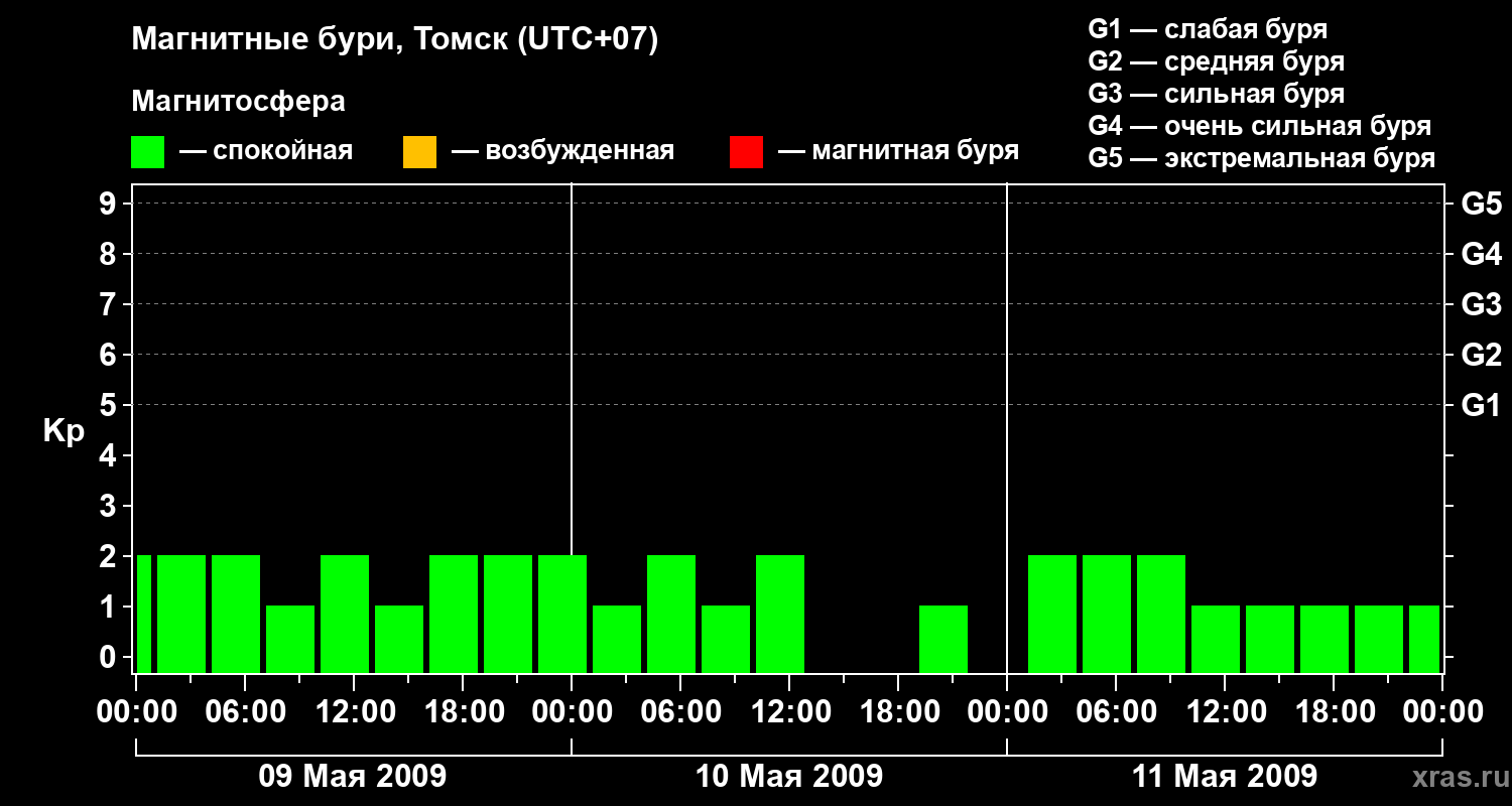 Изменения геомагнитного индекса Kp с 9 по 11 мая 2009 года для средних широт