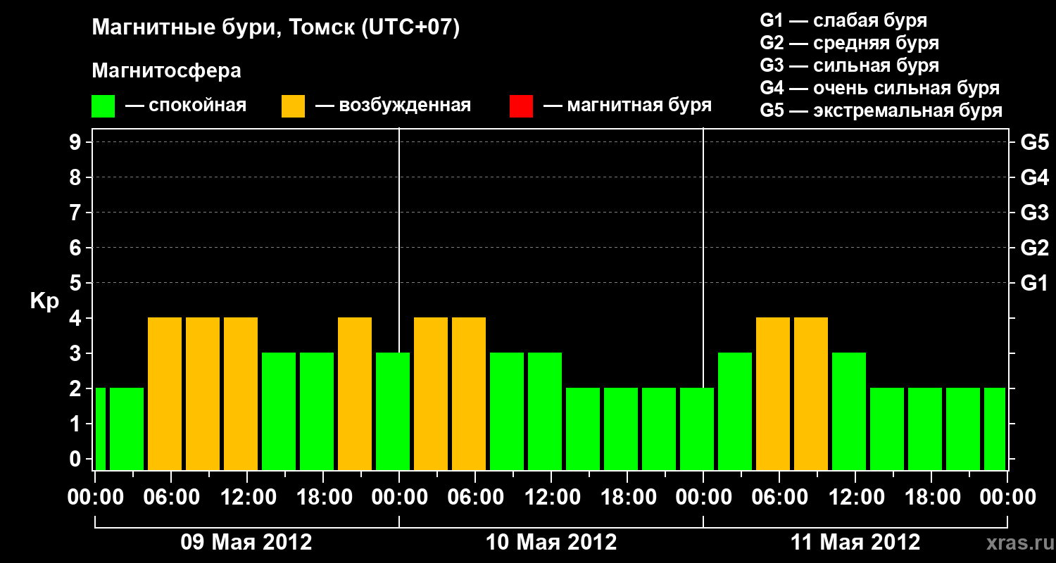 Изменения геомагнитного индекса Kp с 9 по 11 мая 2012 года для средних широт
