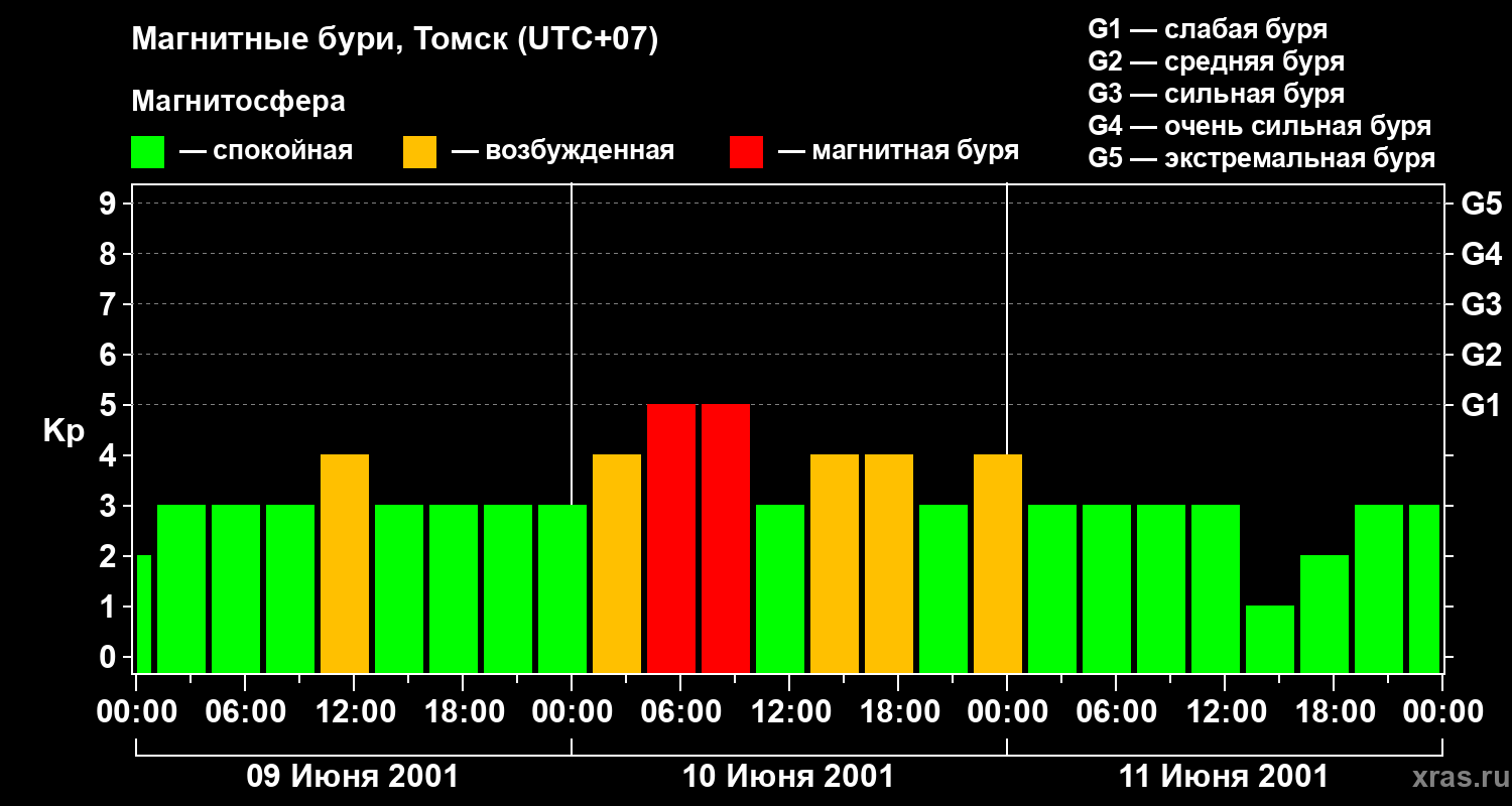 Изменения геомагнитного индекса Kp с 9 по 11 июня 2001 года для средних широт