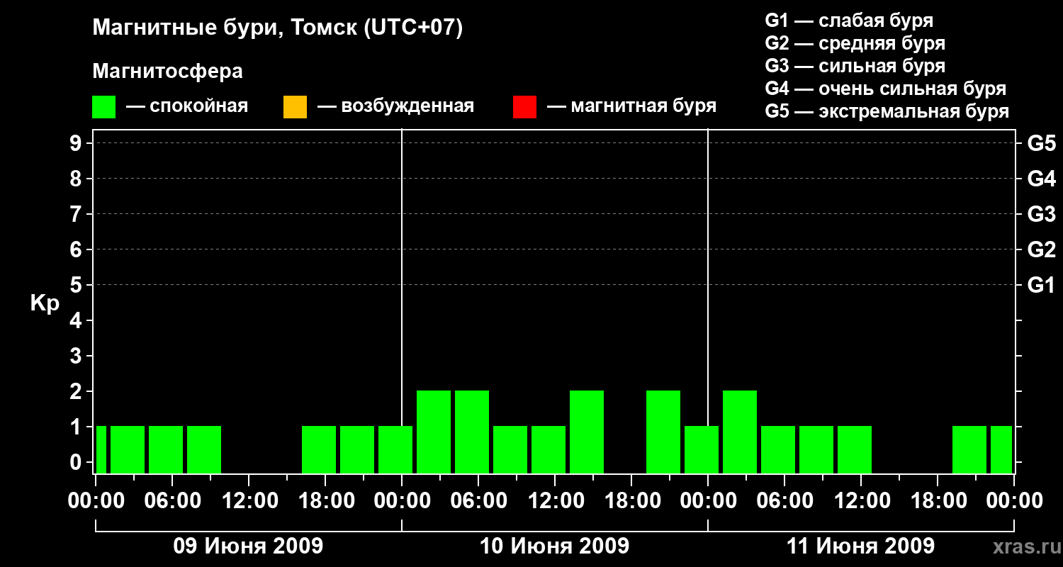 Изменения геомагнитного индекса Kp с 9 по 11 июня 2009 года для средних широт