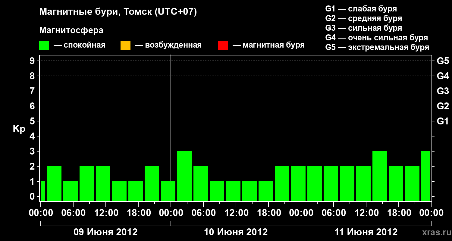 Изменения геомагнитного индекса Kp с 9 по 11 июня 2012 года для средних широт