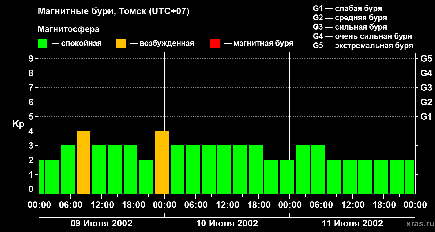 Изменения геомагнитного индекса Kp с 9 по 11 июля 2002 года для средних широт