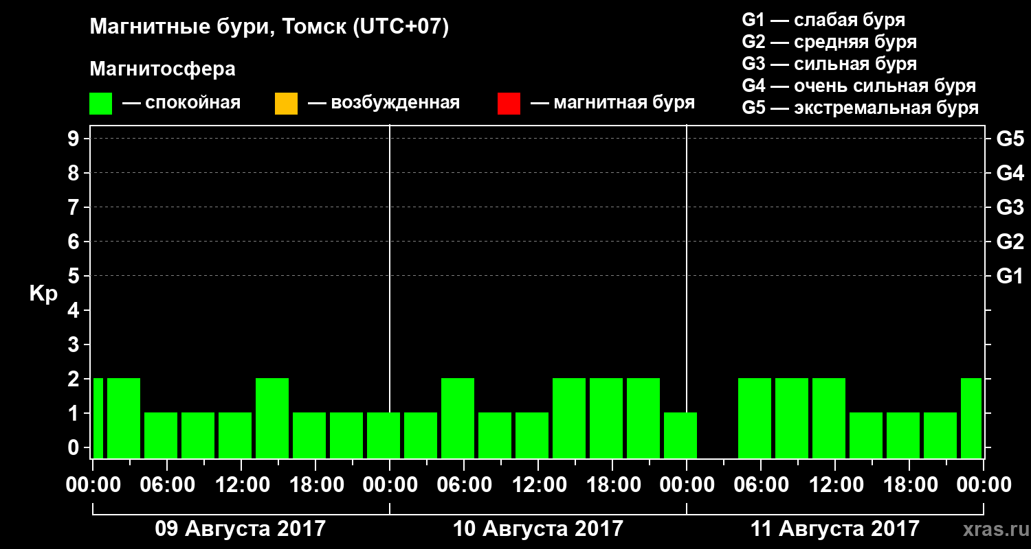 Изменения геомагнитного индекса Kp с 9 по 11 августа 2017 года для средних широт