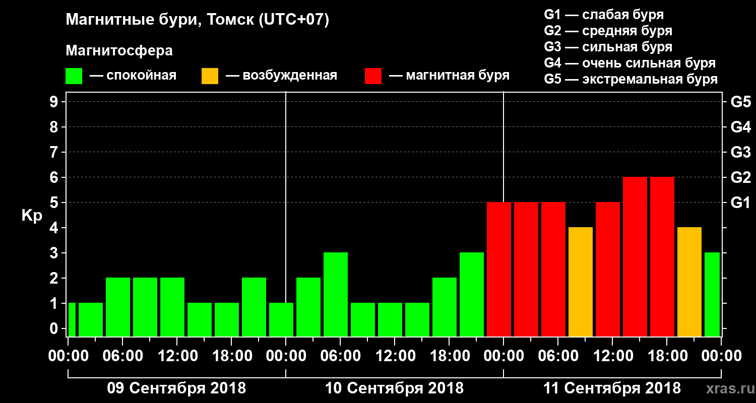 Изменения геомагнитного индекса Kp с 9 по 11 сентября 2018 года для средних широт