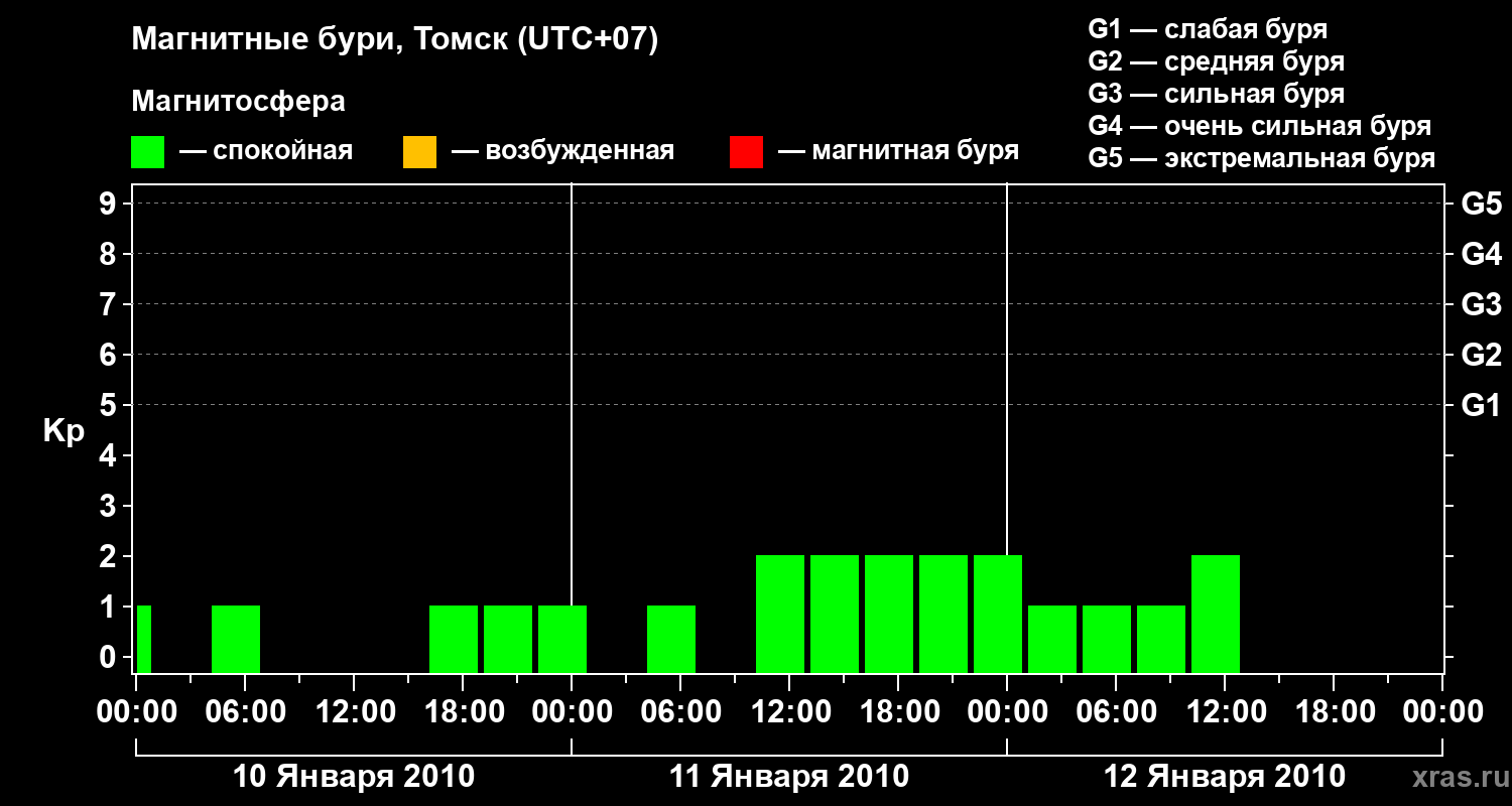 Изменения геомагнитного индекса Kp с 10 по 12 января 2010 года для средних широт
