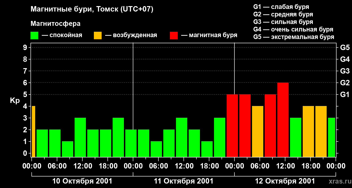 Изменения геомагнитного индекса Kp с 10 по 12 октября 2001 года для средних широт