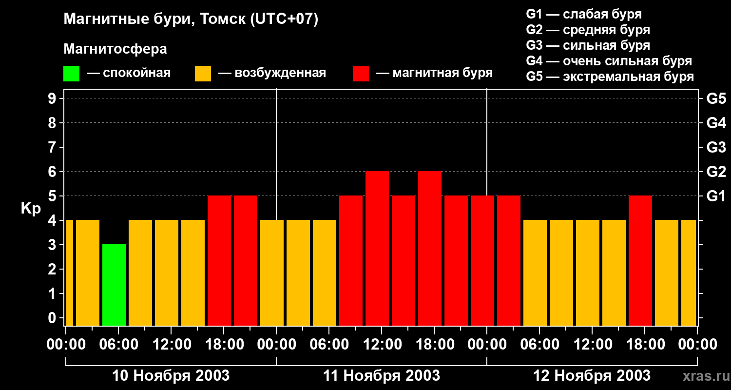 Изменения геомагнитного индекса Kp с 10 по 12 ноября 2003 года для средних широт