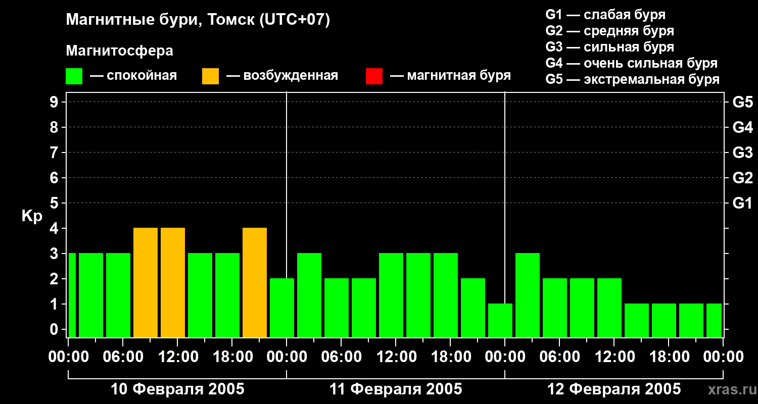 Изменения геомагнитного индекса Kp с 10 по 12 февраля 2005 года для средних широт
