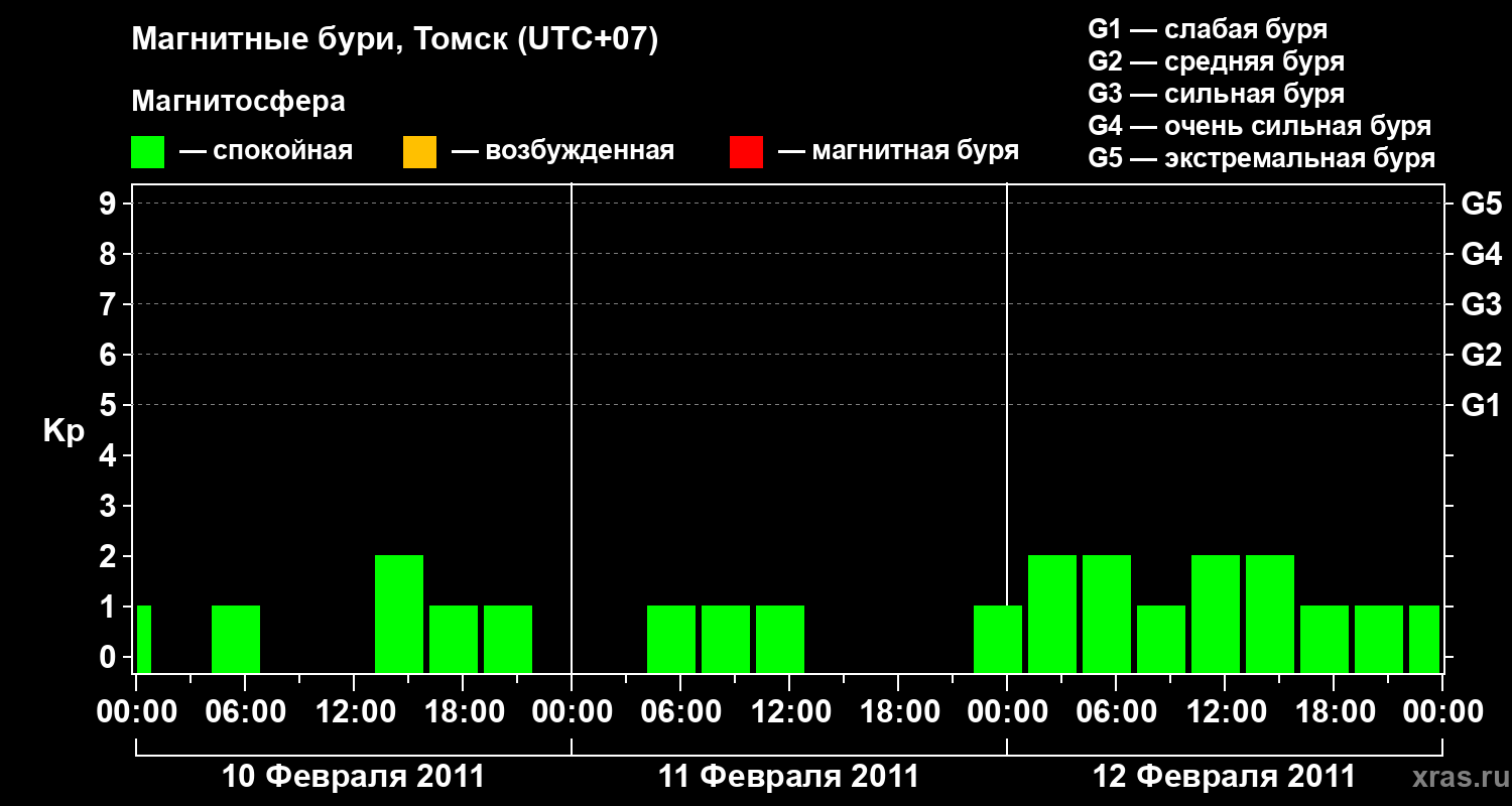 Изменения геомагнитного индекса Kp с 10 по 12 февраля 2011 года для средних широт