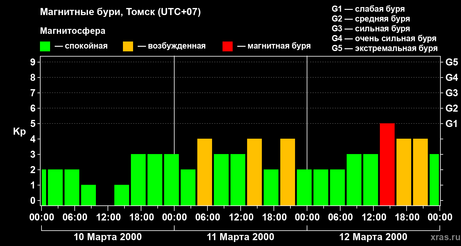 Изменения геомагнитного индекса Kp с 10 по 12 марта 2000 года для средних широт