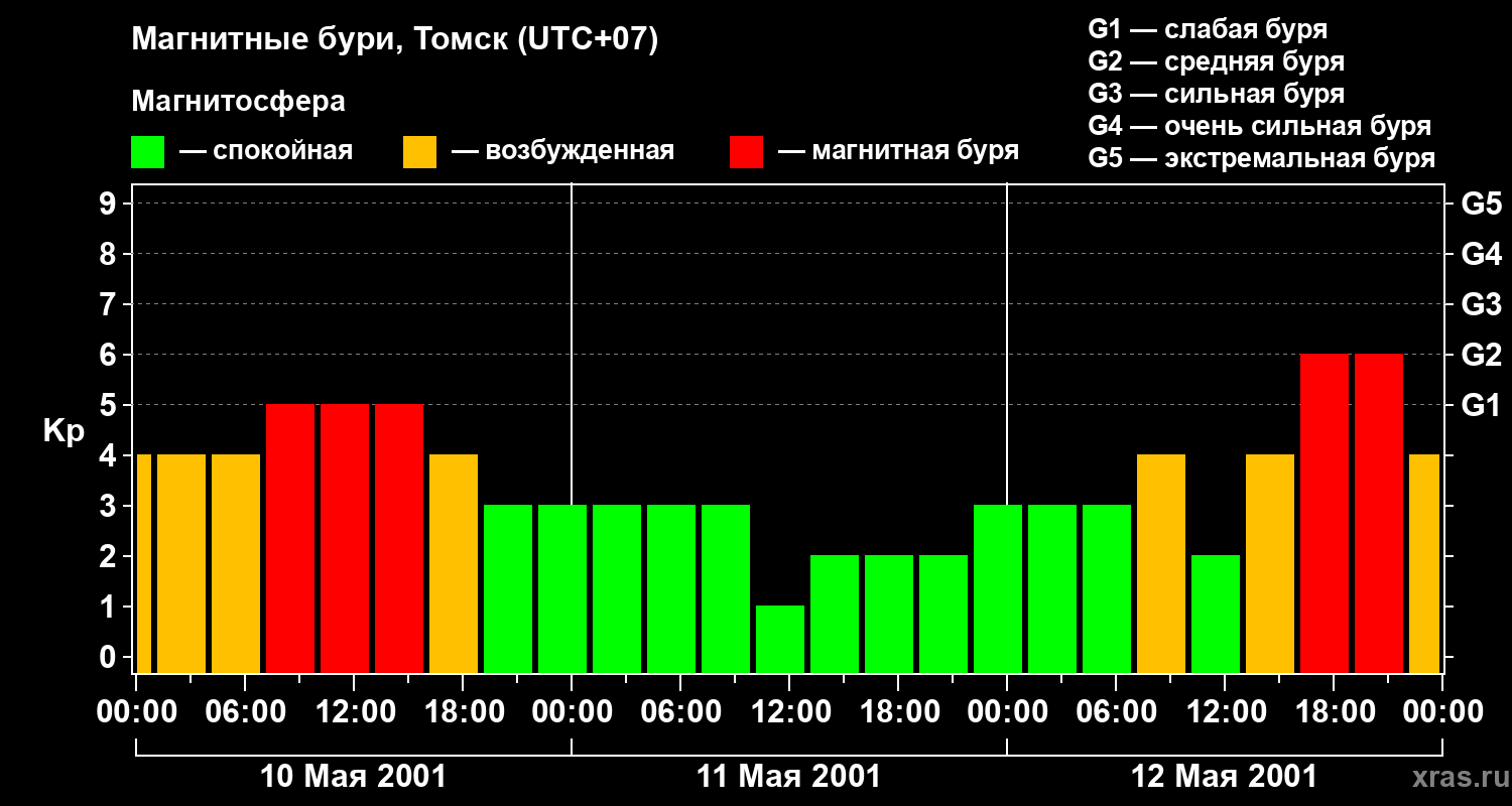 Изменения геомагнитного индекса Kp с 10 по 12 мая 2001 года для средних широт