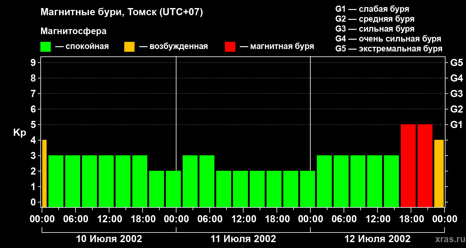 Изменения геомагнитного индекса Kp с 10 по 12 июля 2002 года для средних широт