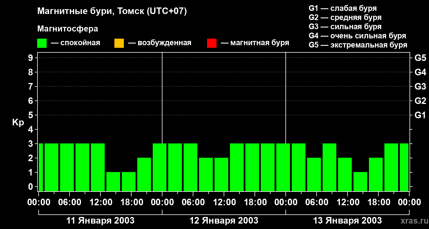 Изменения геомагнитного индекса Kp с 11 по 13 января 2003 года для средних широт