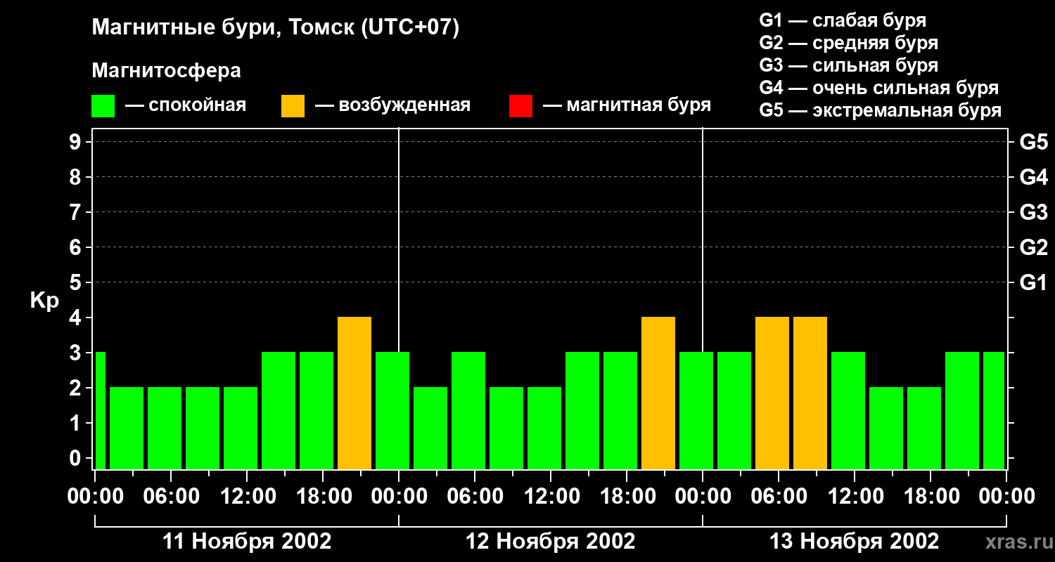 Изменения геомагнитного индекса Kp с 11 по 13 ноября 2002 года для средних широт