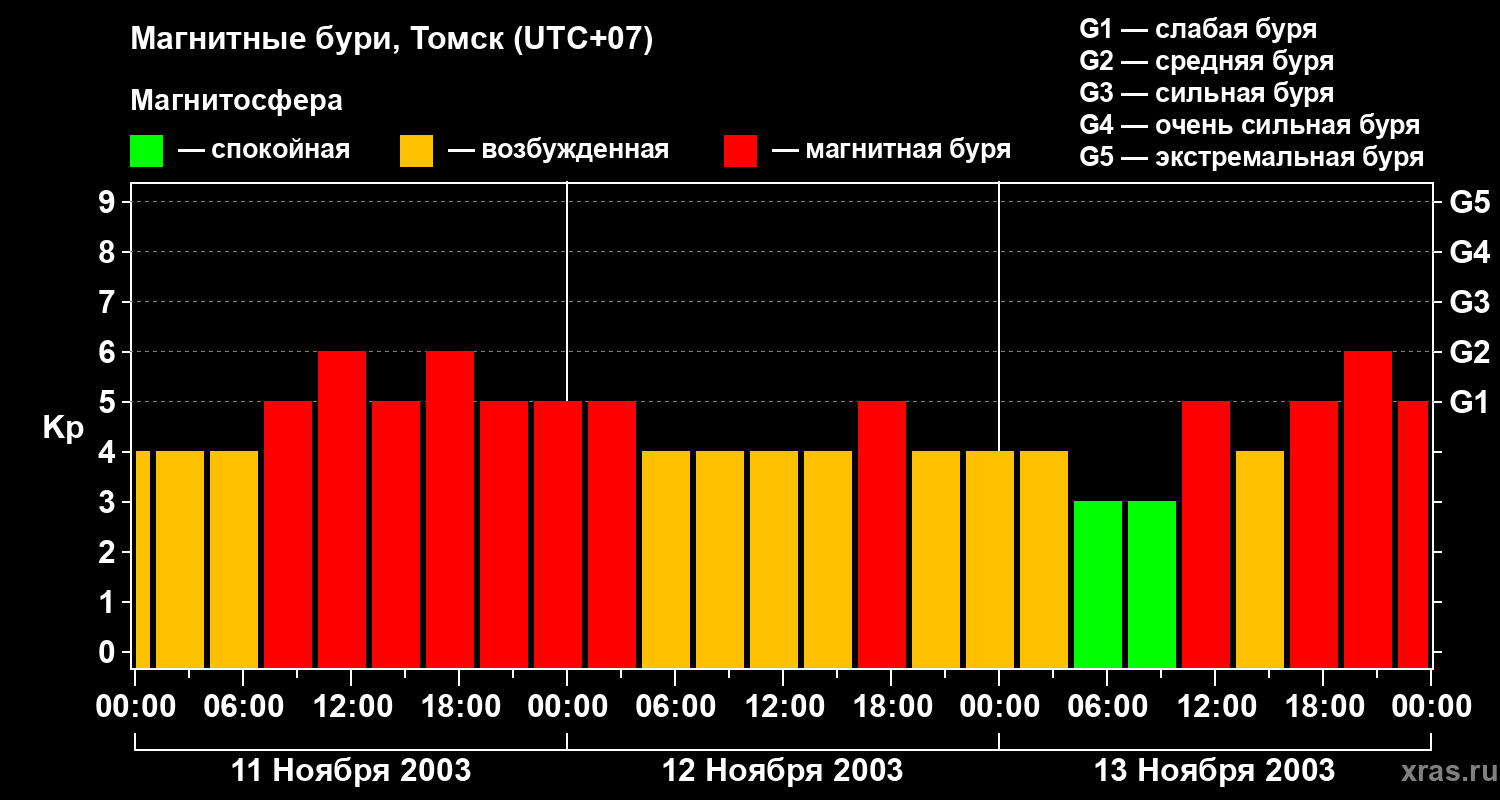 Изменения геомагнитного индекса Kp с 11 по 13 ноября 2003 года для средних широт