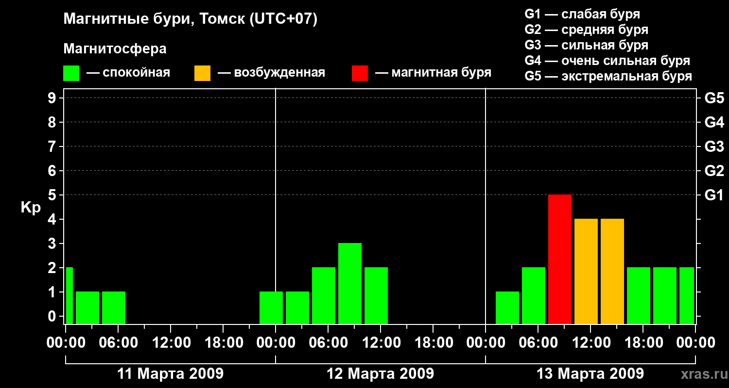 Изменения геомагнитного индекса Kp с 11 по 13 марта 2009 года для средних широт