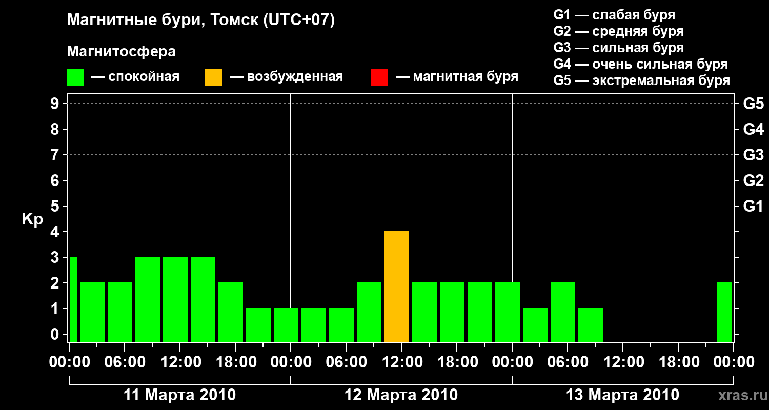 Изменения геомагнитного индекса Kp с 11 по 13 марта 2010 года для средних широт